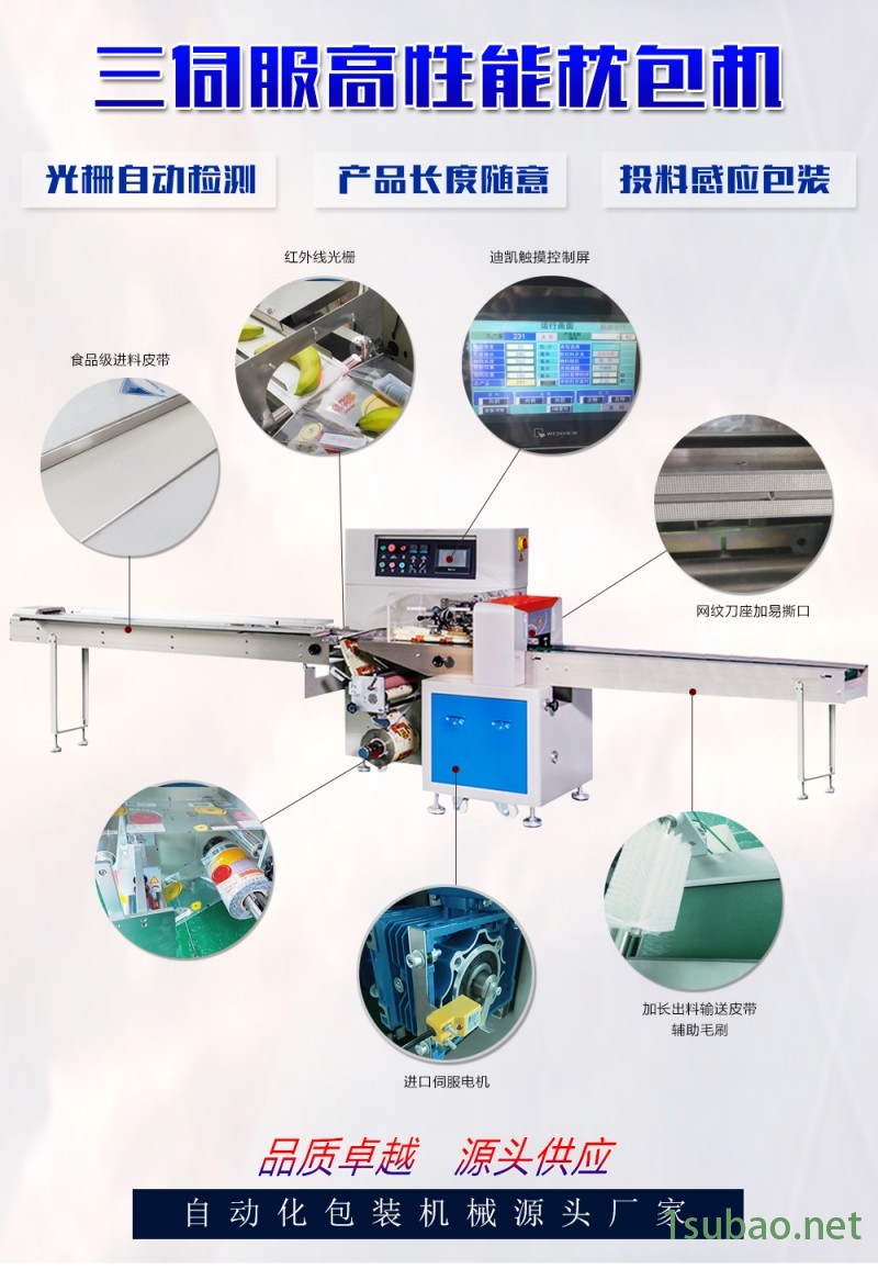 2、 三伺服控制,袋長即設即切,防空包,方切料,省時省膜。