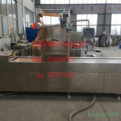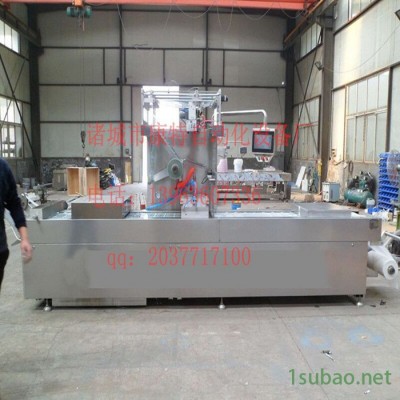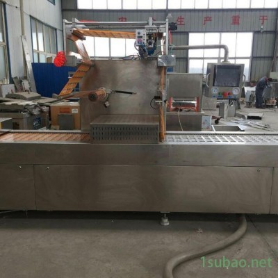 連續拉伸真空包裝機須使用成形模具,先把薄膜加熱,而后再用成形模具沖成容器的形狀,然后將包裝物裝入成型了的下膜腔中,再進行真空包裝。